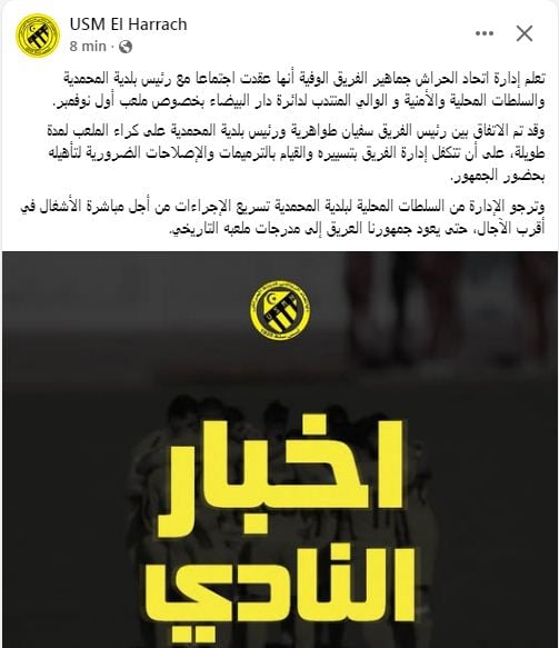 كما دعت الإدارة الحراشية، السلطات المحلية لبلدية المحمدية. إلى تسريع الإجراءات من أجل مباشرة الأشغال في أقرب الآجال، حتى يعود جمهور الاتحاد إلى مدرجات ملعبه التاريخي.
