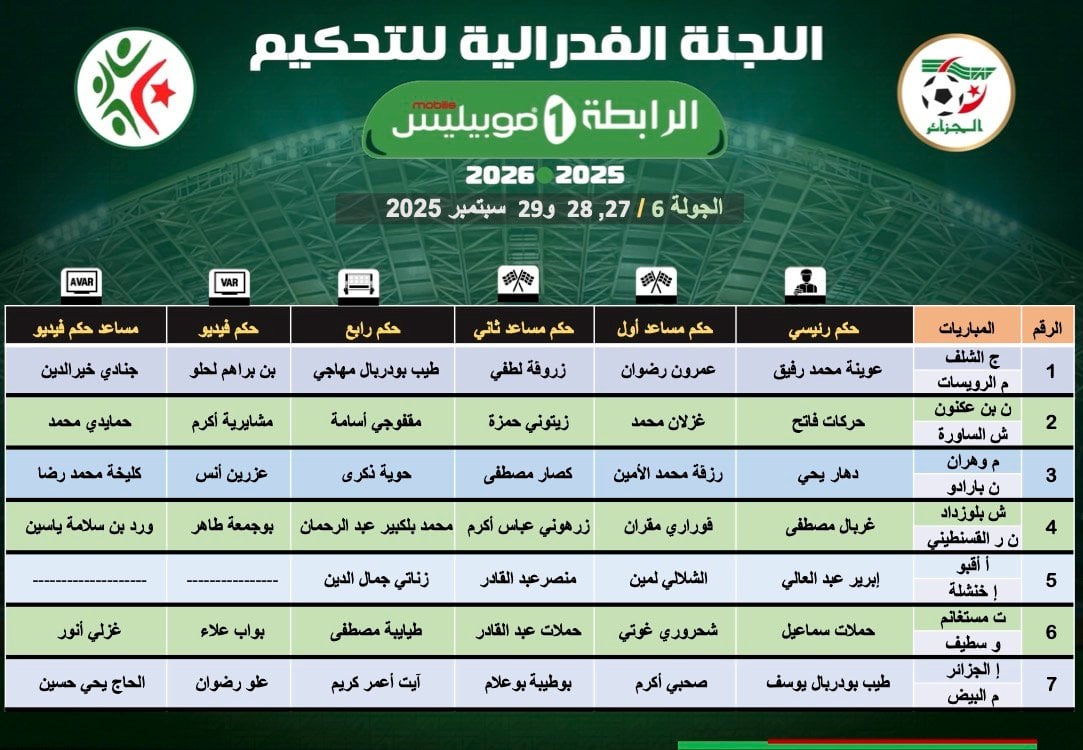 أعلنت اللجنة الفدرالية للتحكيم التابعة للاتحاد الجزائري لكرة القدم، اليوم الثلاثاء، عن قائمة الحكام الذين سيديرون مباريات الجولة السادسة من بطولة الرابطة المحترفة.