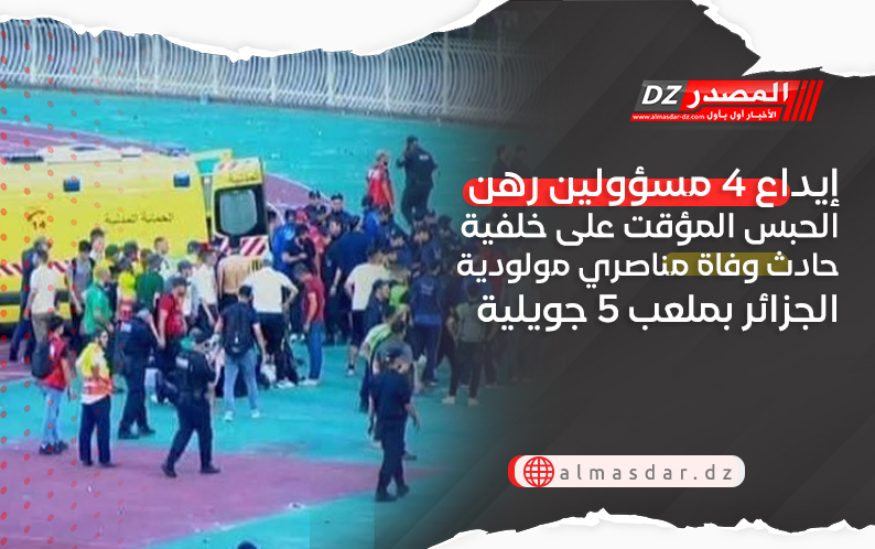 على اثر التحقيق الذي دعى إليه رئيس الجمهورية، في الحادثة الأليمة التي عرفتها مباراة مولودية الجزائر ونجم مقرة على ملعب 5 جويلية، شهر جوان الماضي، والذي أدى إلى وفاة 4 مناصرين من فريق مولودية الجزائر وعدد من الجرحى، أمر قاضي التحقيق بوضع 4 مسؤولين رهن الحبس المؤقت.