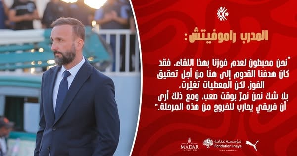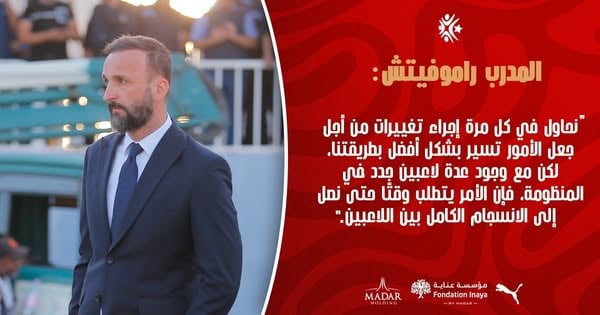 وقال راموفيتش خلال الندوة الصحفية عقب المباراة “نحاول في كل مر إجراء تغييرات من أجل جعل الامور تسير بشكل أفضل بطريقتنا، لكن مع وجود عدة لاعبين جدد في المنظومة، فإن الأمر يتطلب وقتا حتى نصل إلى الانسجام الكامل بين اللاعبين”.
