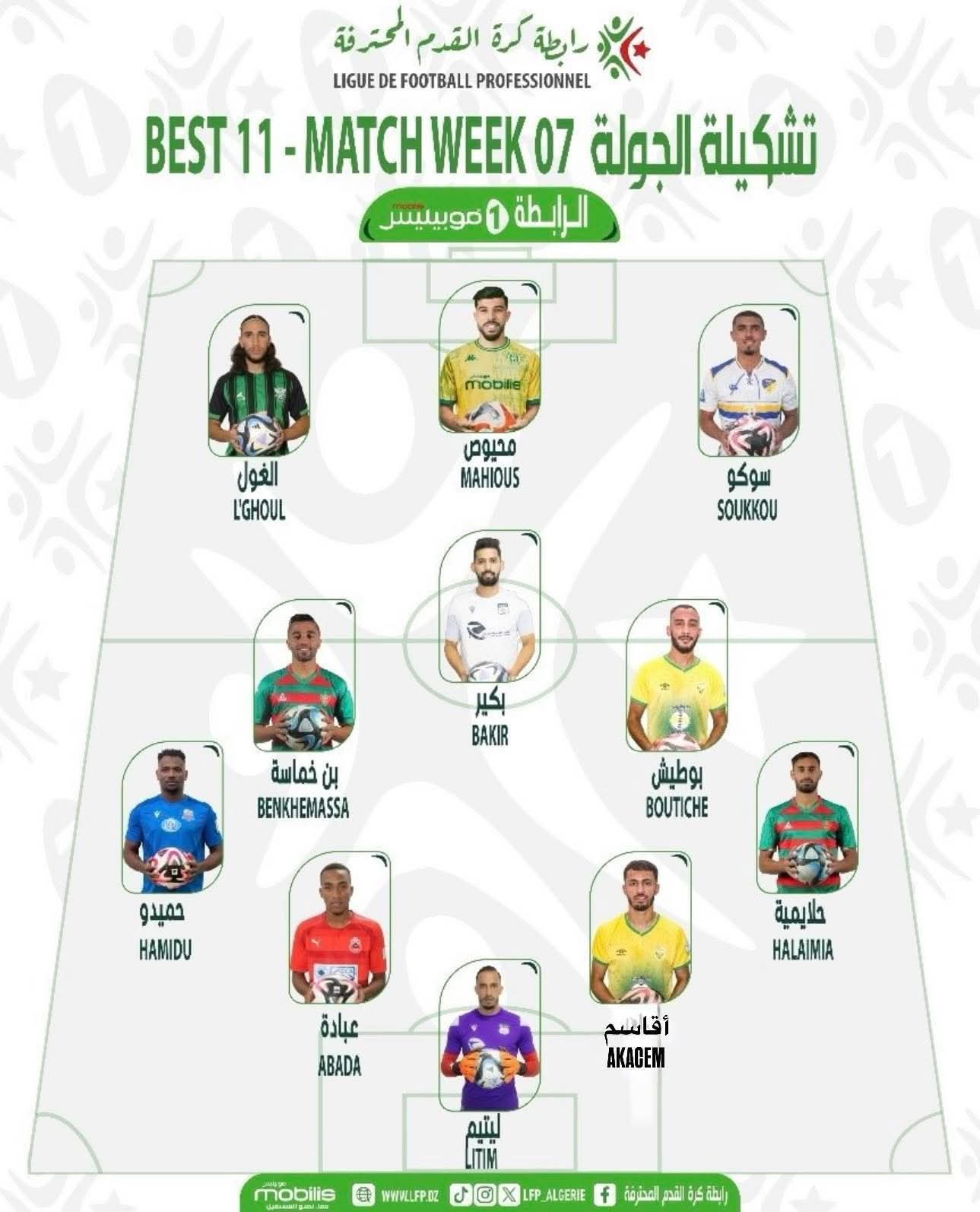 كشفت الرابطة الجزائرية لكرة القدم المحترفة، اليوم الثلاثاء، التشكيلة المثالية للجولة السابعة من بطولة الرابطة المحترفة.