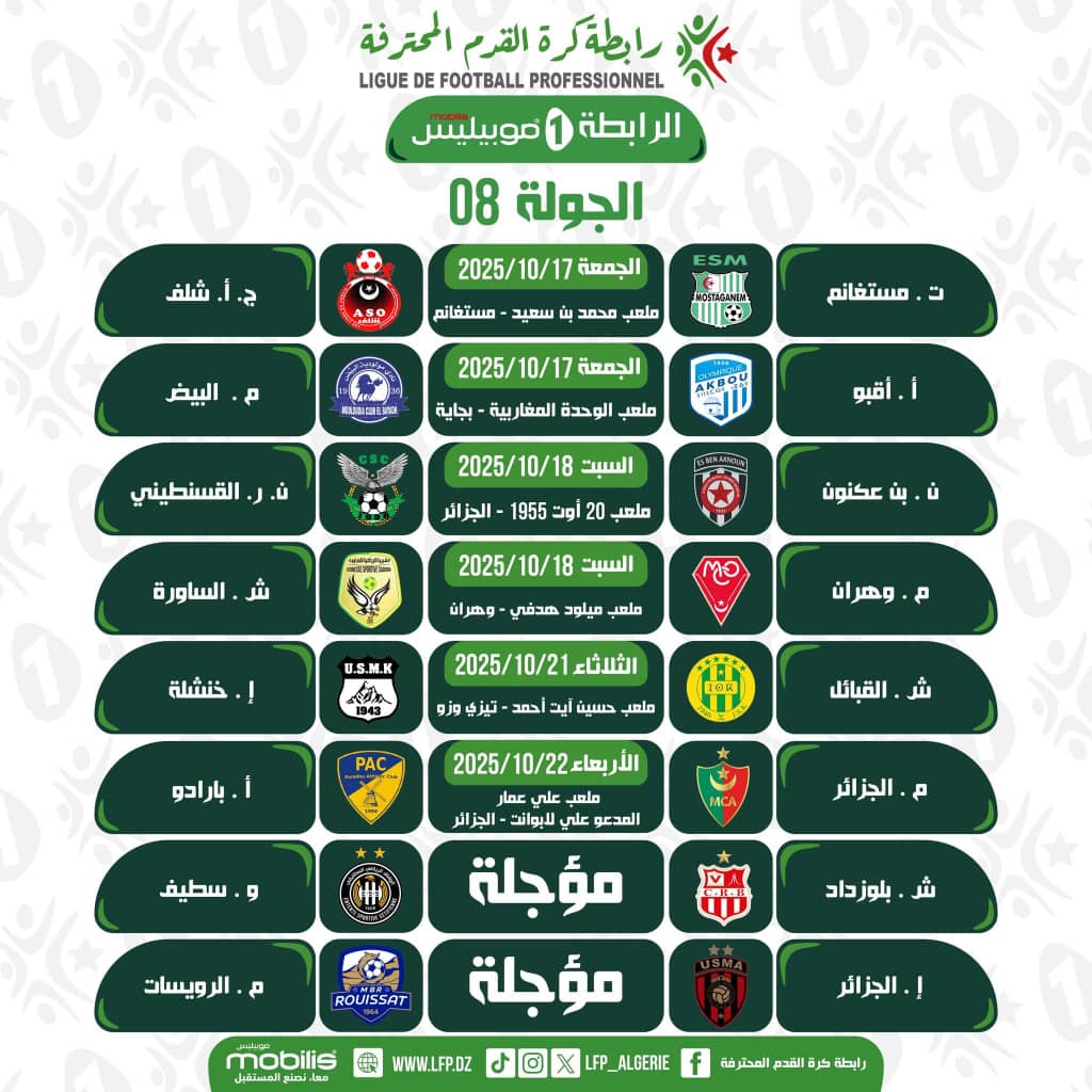 أعلنت الرابطة المحترفة لكرة القدم، اليوم الثلاثاء، عن رزنامة مباريات الجولة الثامنة من بطولة الرابطة الأولى، التي ستجرى بين يومي الجمعة 17 أكتوبر والأربعاء 22 أكتوبر الجاري.
