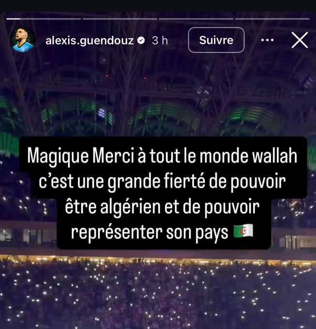وأرفق ألكسيس قندوز، هذا التعليق، بصورة للأجواء الاحتفالية التي صنعتها الجماهير الجزائرية، أمس الثلاثاء، بملعب “حسين آيت أحمد” عقب فوز المنتخب الوطني بثنائي لهدف على منتخب أوغندا، وترسيم تأهلهم لكأس العالم 2026.