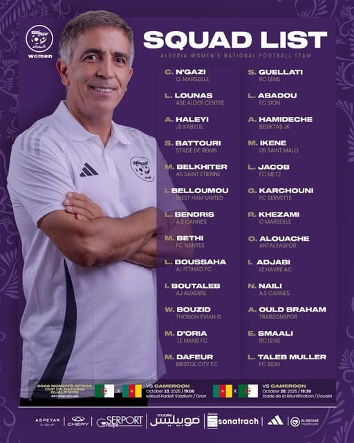 أعلن مدرب المنتخب الوطني الجزائري للسيدات فريد بن ستيتي عن قائمة اللاعبات المعنيات بالمواجهة المزدوجة أمام منتخب الكاميرون، لحساب الدور الثاني من تصفيات كأس أمم إفريقيا 2026.