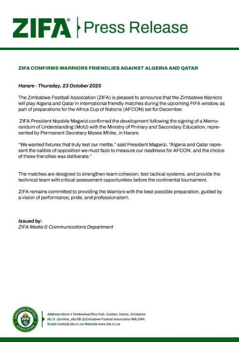 سيخوض المنتخب الوطني لكرة القدم، مباراة ودية تحضيرية، في مواجهة منتخب زيمبابوي، تحضيرا لمشاركتهم في الطبغة المقبلة من كأس أمم إفريقيا 2025.