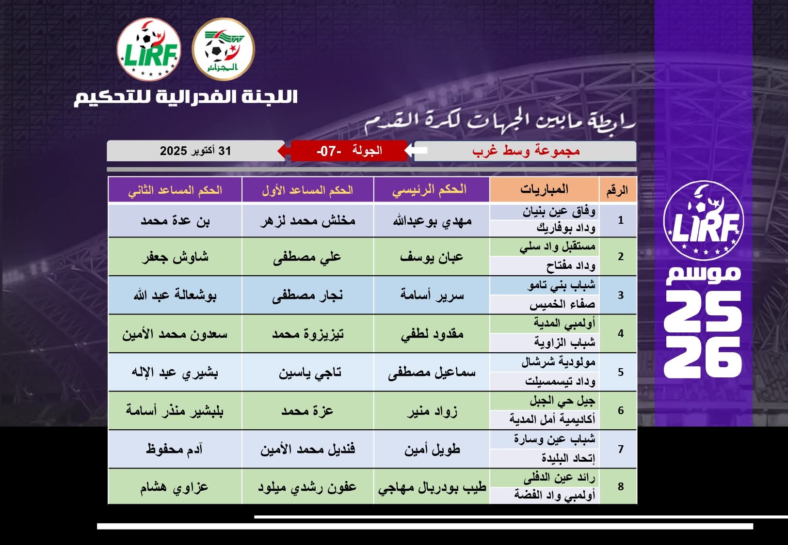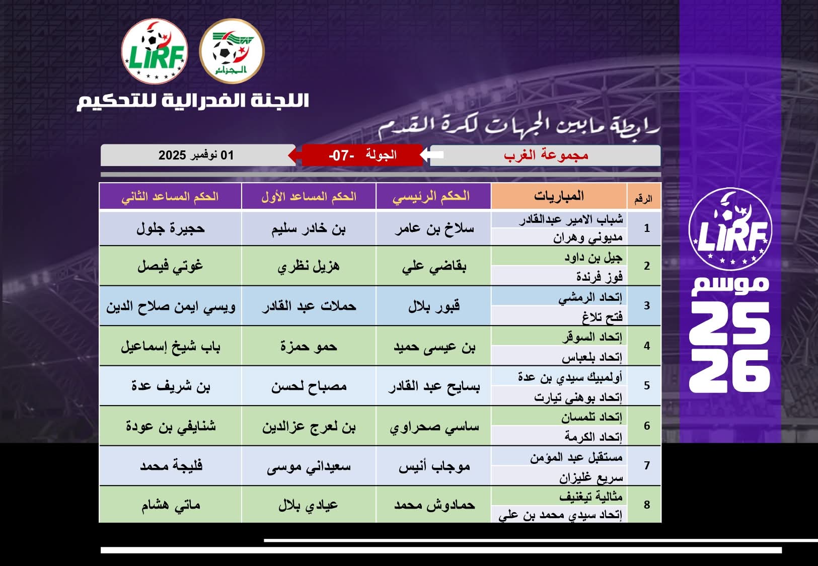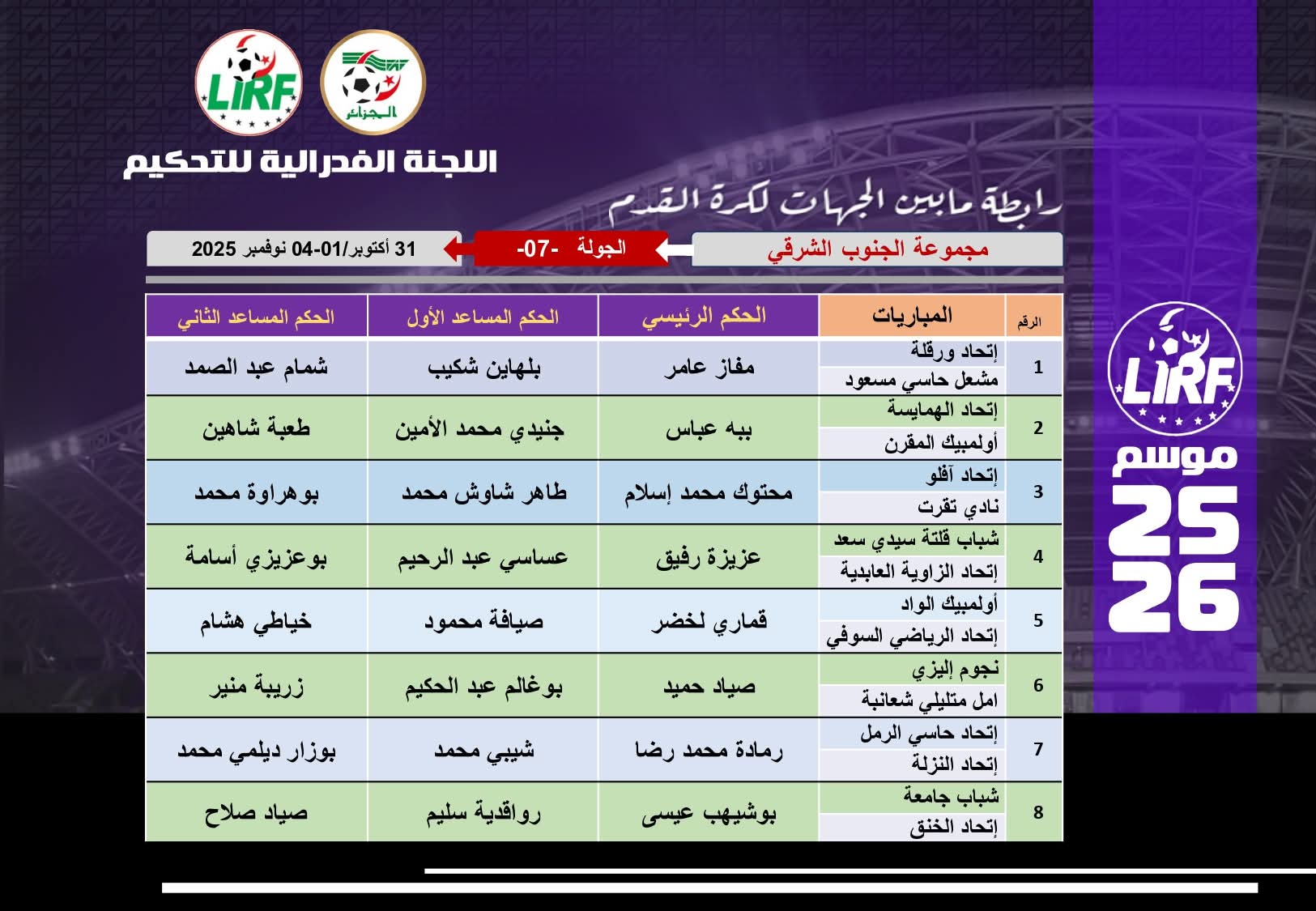 كشفت لجنة التحكيم التابعة للاتحادية الجزائرية لكرة القدم، اليوم الثلاثاء، عن قائمة الحكام المعنيين بإدارة مباريات الجولة السابعة من بطولة ما بين الجهات.