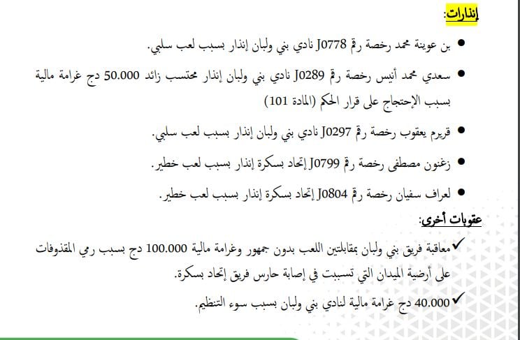 حيث تقرر توقيف لاعب بني ولبان، توات محمد، بالايقاف لـ 3 لقاءات نافذة وغرامة مالية بقيمة 2.5 مليون سنتيم، بسبب الضرب المتبادل.