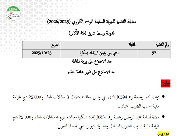 ونشرت الهيئة الكروية عبر موقعها الالكتروني. قرارات اللجنة الانضباطية الخاصة بلقاءات الجولة الـ 7 من بطولة الهواة، بمجموعتيها “وسط – شرق” و”وسط-غرب”.