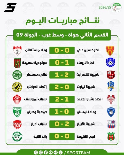 عرفت الجولة التاسعة من بطولة القسم الثاني هواة وسط غرب مباريات مثيرة ونتائج متقاربة بين مختلف الأندية.