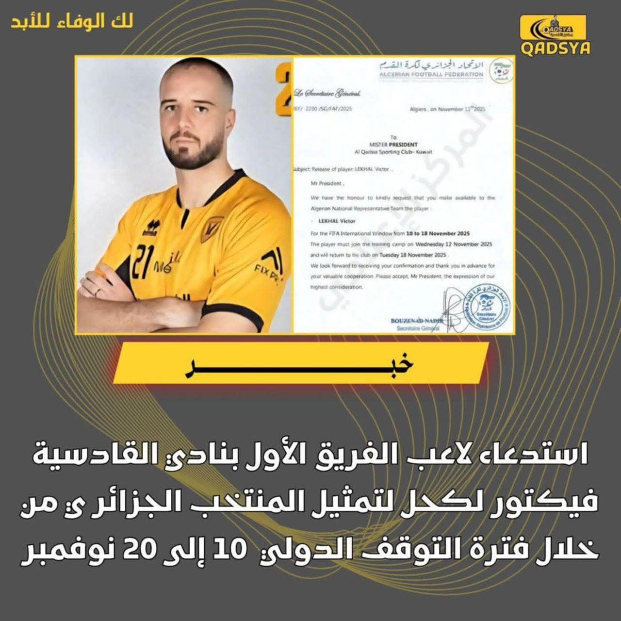 أعلن نادي القادسية الكويتي، اليوم الثلاثاء، تلقيه مراسلة رسمية من الاتحادية الجزائرية لكرة القدم، تفيد باستدعاء لاعب الفريق، فيكتور لكحل.