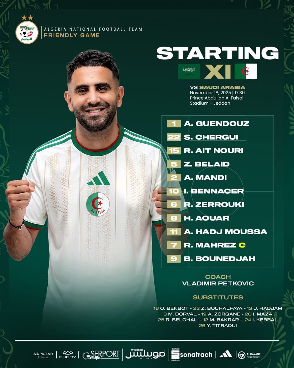 وتصدر القائد رياض محرز، هذه التشكيلة الأساسية للخضر، التي ستبدأ المباراة التحضيرية ضد المنتخب السعودي.