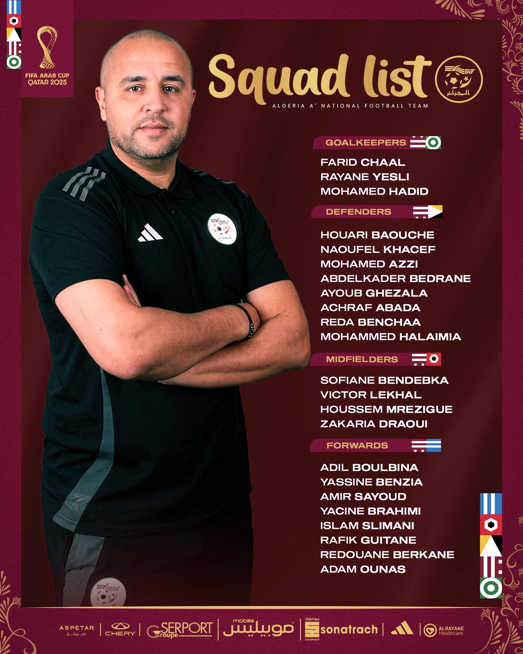 كشف مدرب المنتخب الوطني للمحليين، مجيد بوقرة، اليوم الأحد، قائمة اللاعبين الذين اختارهم للمشاركة في بطولة كأس العرب 2025.