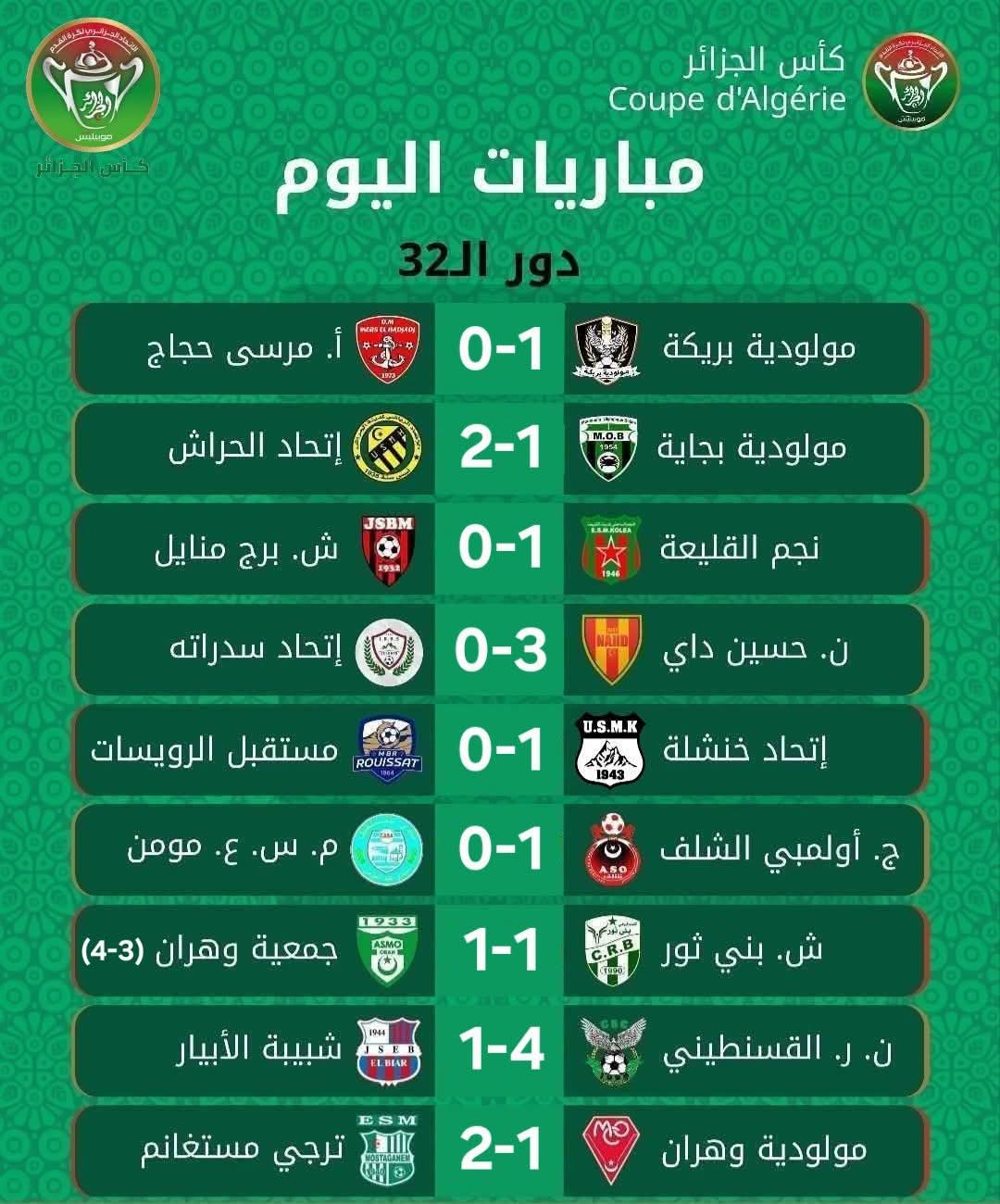 تواصل منافسة كأس الجزائر، كتابة فصوله المثيرة في الدور 32، بعدما شهدت المباريات مفاجآت مدوية وانتصارات كبيرة رسمت ملامح مرحلة جديدة من المنافسة الأكثر شعبية في البلاد.